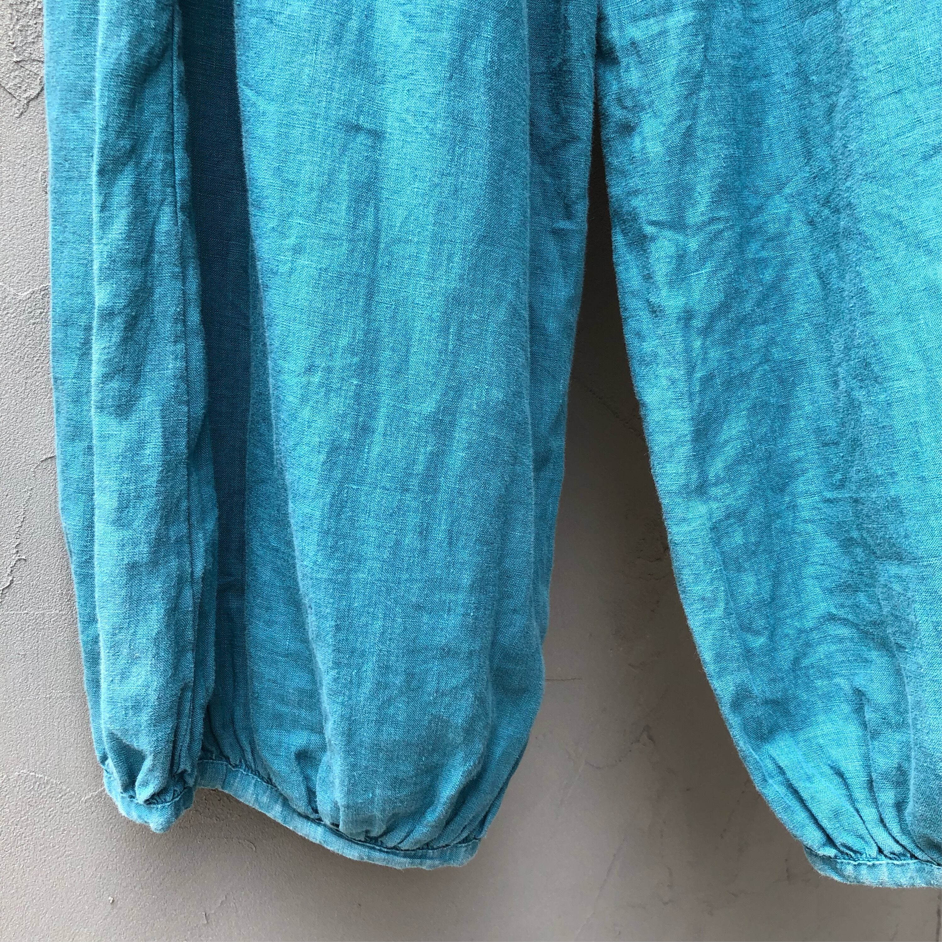 麻素材、青緑色の個性的なパンツです。
